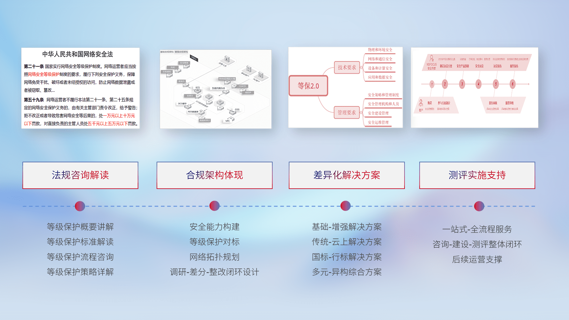 通过专业的法律咨询解读、、合规架构体现、、、、差异化解决方案、、、测试实施支持等服务,,为客户量身打造等保合规体系。。